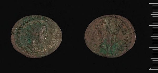 Curator: There's something profoundly human about this corroded coin, this Antoninianus of Carinus residing at the Harvard Art Museums. It feels weighty, doesn't it? Like a forgotten promise. Editor: Yes, almost pathetically so. The green-gray patina tells a story of being buried, lost, maybe even deliberately hidden. Curator: Carinus himself, the figure represented here, was Roman Emperor for a very brief time. Coins like this one, minted with his image, were vital tools of imperial propaganda. A way to assert power, even far from Rome. Editor: And yet, time and earth have rendered that assertion almost illegible, haven't they? It makes you wonder what other grand pronouncements will one day be reduced to such ghostly echoes. Curator: It's a reminder that power, like art, is only as enduring as its cultural context. It all fades, eventually, leaving behind only fragments. Editor: Perhaps the greatest art lies in accepting that inevitable decay. Curator: Absolutely. This little coin, in its own way, teaches us humility.
