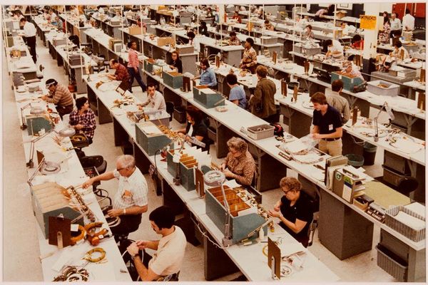 Editor: This is an untitled photograph by Jack Gould, taken at an unknown date, showing businesspeople at desks. The high contrast of the black and white gives it a stark, almost sterile feel. What do you see in the composition? Curator: Observe how the orthogonal lines of desks recede into the background, creating a sense of depth. The figures, though numerous, are rendered as repetitive, almost anonymous forms. Note the interplay between the geometric architecture and the organic shapes of the individuals. What is your interpretation? Editor: It seems to emphasize the depersonalization of labor, perhaps? The individuals become part of the machine. Curator: Precisely. The composition, through its formal elements, evokes a sense of alienation. It is a masterful study of form and content. Editor: I see it now. Looking at the repetitive shapes helps understand the intended message. Curator: Indeed. The image invites contemplation on the nature of work and the individual's place within a structured system.