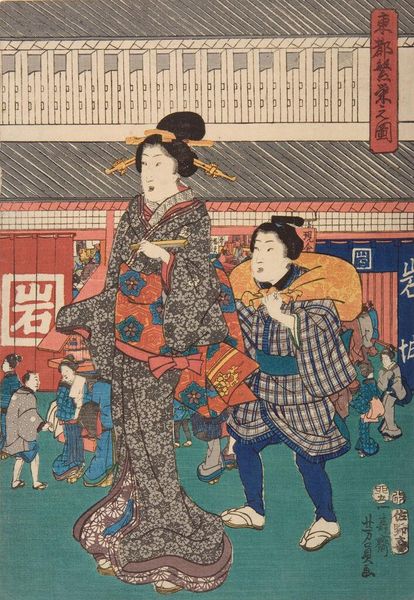 Editor: So, this is Utagawa Yoshikazu's "Street Scene with Geisha and Courtesan." The prints are so vibrant. What strikes me is the sheer volume of textile detail. What do you see in the making of this piece? Curator: Precisely! The woodblock printing process itself speaks volumes. Each color requires a separate block, implying an extensive workshop and division of labor. Consider the social context of ukiyo-e prints—mass-produced for consumption by a burgeoning urban class. Editor: That's fascinating! So, the print itself becomes a commodity, mirroring the lives of the women depicted? Curator: Exactly. The geisha and courtesan, also commodities within that society, are represented through a process of mass production and consumption. It blurs the lines between art, craft, and the social realities of labor. Editor: I never thought about it that way. It really shifts how I view the piece. Curator: Indeed. By considering the materials and means of production, we gain a deeper understanding of the artwork's relationship to its historical context.