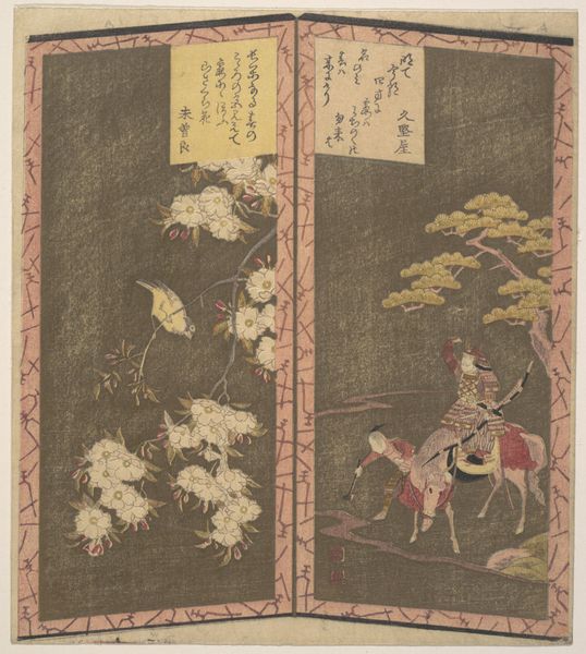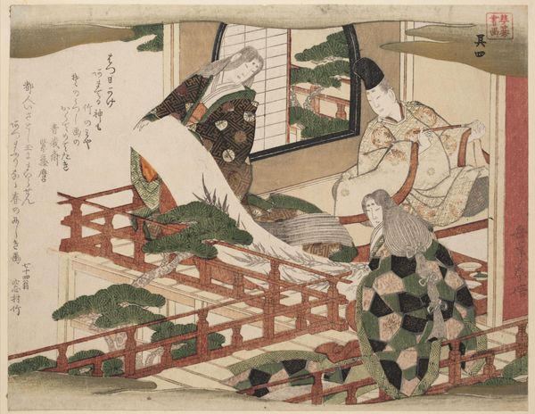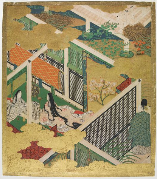 Curator: This illustration, in the manner of Tosa Mitsuyoshi, depicts a scene from the fifth chapter of the Tale of Genji, titled "Young Murasaki". Editor: It's dreamlike, almost a stage set. The figures are elegant but also strangely flattened, existing within these pools of color. Curator: It reflects the conventions of Heian-period painting. The artist captures a moment of encounter, likely referencing Genji's first glimpse of the young Murasaki. Note the composition and the attempt to capture space and depth. Editor: But who gets to be seen, and from what position? The woman walking away from the group feels particularly interesting. Is she leaving, or being excluded? How are gender and power expressed in this controlled setting? Curator: The Tale of Genji is a cornerstone of Japanese literature, and illustrations like these offered a visual narrative for a broader audience. Editor: And who was that audience? Courtly elites, no doubt, whose lives and desires were so explicitly centered. It makes you consider who gets to tell these stories, and who is left out of the frame.