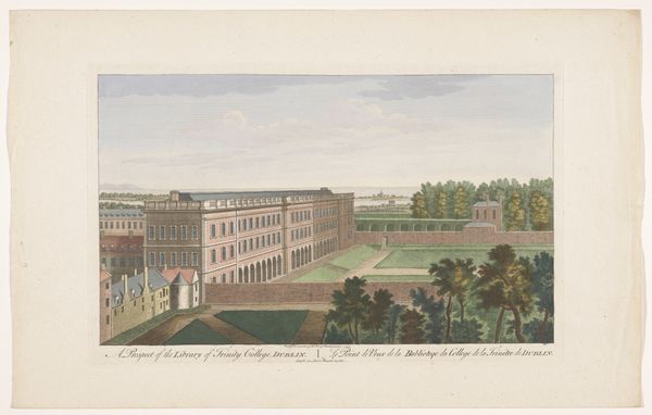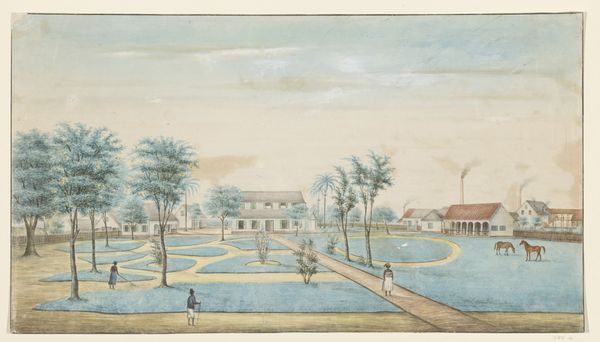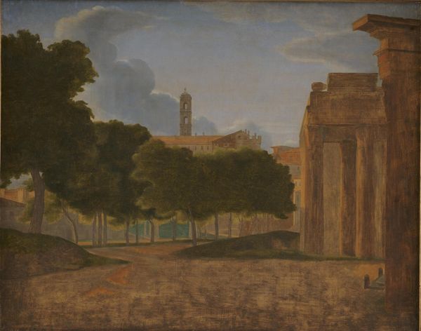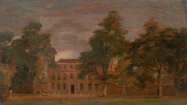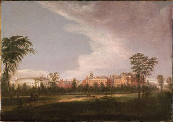 Curator: Richard Wilson's "View of Carlton House, with a Royal Party in the Grounds" is a fascinating glimpse into the leisure of the British elite. It's an oil on canvas, currently residing in the Tate Collections. Editor: My first impression is one of serene distance. We’re observers, separated from the frolicking figures by a carefully constructed landscape. Curator: Wilson often portrayed country estates, reflecting the power and prestige associated with land ownership in 18th-century Britain. Carlton House, then the residence of the Prince of Wales, was a significant political and social hub. Editor: There’s a feeling of staged informality. The royal party, while enjoying themselves, are very much on display, reinforcing their status through curated leisure. The clouds are also interesting...almost like a painted stage curtain. Curator: Exactly! The composition, with its tiered gardens leading to the open lawn, invites us to contemplate the relationship between the aristocracy and the landscape they shaped. Editor: It makes you wonder about the lives of those tiny figures. Were they truly carefree, or were they always performing for an unseen audience? A beautiful, yet subtly unsettling piece.