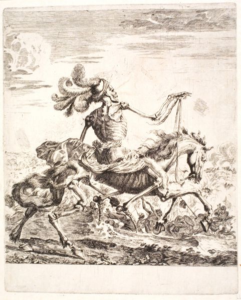 Editor: Here we have Jan van Vianen's engraving, "Ruiterportret van Maria II Stuart," dating from 1689 to 1726. I am struck by the sheer power of this image – the Queen on horseback overlooking what seems to be an entire city, a procession even. What's your interpretation? Curator: This is an example of carefully constructed propaganda. Note how Maria is positioned above the cityscape, almost divinely sanctioned. The city becomes a theatrical backdrop for her authority, linking her to a legacy of power. This piece promotes the narrative of her legitimate rule following the Glorious Revolution of 1688, framing her actions within an almost predetermined sense of liberty granted from on high. Editor: So the surrounding angelic figures solidify the idea of Mary being the bringer of this freedom? Is this purely celebratory? Curator: Consider who is absent: William of Orange. While the revolution was a joint effort, this piece strategically centers Maria. We must examine this portrait not just as an artwork but as a carefully curated assertion of female leadership, subtly navigating a patriarchal landscape. Was this meant to ease anxieties about a Queen regnant? The history of gendered power relations shapes how this piece functioned and was received. Do you think this piece portrays female power as inherently benevolent, or as something earned through circumstance? Editor: That's fascinating. It’s so complex to view something like this as a construction intended to sway opinions about women. I’d not considered it that way before. Curator: Precisely. The visual language reinforces certain ideologies. The symbolism—the landscape, the cherubs—all contribute to an intricate dance between art, gender, and power. Now, when you look at the portrait, what are some assumptions that immediately jump out? Editor: Looking again, it makes you wonder what details have been deliberately included, or left out. This reframing forces me to reconsider these pieces in terms of cultural, not purely artistic, intentions. Thanks!