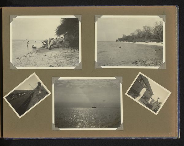 Curator: Let's turn our attention to this album page titled "Vijf foto's van een reis naar Marseille, Griekenland en Turkije", created between 1926 and 1929 by Carolina (Loentje) Frederika Onnen. It presents five albumen prints, snapshots really, documenting her travels. What are your initial impressions? Editor: They feel very self-contained. Framed by the sepia of the album page, each photograph seems like its own little world, like windows into memories carefully placed and preserved. There's a somber quality to them. Curator: Absolutely. Onnen captured moments steeped in their symbolic contexts. For example, the view labeled "Château d'If" echoes the themes of imprisonment and isolation from Alexandre Dumas’ novel, "The Count of Monte Cristo", doesn't it? While other pictures represent collective experiences, and family. They create meaning based on cultural heritage. Editor: I'm drawn to the composition in the two pictures marked with “Château d’If.” One photograph focuses sharply on a pair of figures against an expanse of bright sand, almost like a minimalist portrait set against negative space, with tiny background characters added to suggest depth. It is placed next to a classic landscape depicting shorelines and water with high tonal contrasts that provide graphic definition. These variations demonstrate sensitivity towards different elements present at this site. Curator: And the third picture—labelled "Injang Bazar Hambal"—presents this idea of the threshold, of crossing over into a different realm. Those figures lurking in the shadowed archway give me pause. They make me wonder about her understanding of culture and tradition. Editor: That focus on threshold carries over even into "Izmail" and "Charmash – Corumla," cityscapes taken from overlooking points with roads disappearing toward somewhere beyond our view. Speaking of the composition in “Izmail,” note how the upper trees frame everything leading down towards those human subjects seated on whatever motor-powered contraption they were traveling in! Curator: It seems travel itself then, holds significance. This album functions as a means of recording both a personal journey and the visual and symbolic language encountered along the way. Editor: Indeed, it underscores how form follows function, as a means of carefully crafting a highly personal memory of place, where meaning and sentiment blend and layer in intricate and moving ways.
