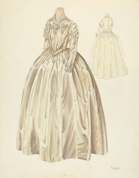 Curator: Welcome. Before us is "Woman's Dress," a drawing rendered in pencil by Jessie M. Benge, circa 1940. Editor: It projects a feeling of understated elegance, wouldn’t you say? The lines are clean, precise... and there's a muted palette that adds to the refined impression. Curator: Absolutely. Note how Benge used line weight and shading to delineate form and volume. Observe the precise control evident in the depiction of the folds and gathers, achieving a textural depth that implies luxurious fabrics. The composition itself is also intriguing—a complete view of the dress, alongside a rear sketch that demonstrates shape. Editor: Precisely, the dress signifies the restrictive codes that governed women’s appearances. This isn’t merely a dress; it’s a symbol of the gendered expectations imposed on women, especially during this historical period, shaping how they were perceived and interacted with in society. Consider the societal context—the looming war, changing gender roles, yet this image harkens back to something almost... prim. Curator: Your point is well-taken regarding its cultural implications, though I’d argue that Benge is more interested in exploring formal pictorial elements and surface qualities. See how the varying pencil strokes catch the light and emphasize the dress's three-dimensional presence on the page. She really is mastering rendering techniques here! Editor: But the artist's intentions, are always a product of the societal context! The formality and restricted movement suggested by the dress also subtly reflect power dynamics. And yet, by memorializing it, she prompts a consideration of that female figure, caught within those expectations, but somehow now existing apart from them, outside of time... Curator: Hmm, indeed. A lot of complex lines in a dress, literally, and metaphorically, it seems. Editor: It speaks volumes about what it meant to be a woman in 1940. Thanks for expanding my perception!