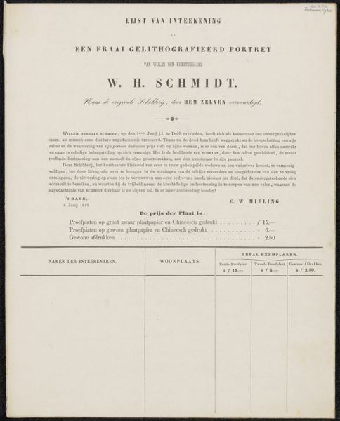 Editor: This is a prospectus and subscription form by Johannes Jelgerhuis, likely from 1827. It's a print on paper featuring typography, currently held at the Rijksmuseum. What catches my eye is the emphasis on gesture and mimicry – why were these theoretical lessons so important? Curator: Ah, precisely! Notice the names invoked: Engel, Le Brun, van Mander, Camper... These are key figures in the history of art theory, particularly concerning the expression of emotion. The inclusion of Jelgerhuis himself situates the piece within a cultural memory concerned with portraying character on stage, the transmission of emotion through performance. Editor: So, this wasn't just about acting, but also about conveying something deeper? Curator: Consider what performance *means*. It's a staged reflection of human experience. Jelgerhuis’ focus on ‘gesticulation and mimicry’ suggests an effort to decode and codify nonverbal communication, to bring theatrical expressions into alignment with established classical forms, ensuring understanding and moral interpretation by its audience. How might this connect to social understanding at the time? Editor: I hadn't thought about the connection to moral interpretation. Was there a fear that unchecked emotion, unchecked physical expression, could be dangerous? Curator: Precisely! Control over the body becomes a way of reinforcing societal order. The ‘Theoretical Lessons’ offer a way to standardize outward displays of emotions. Even this seemingly simple invitation for subscription embodies deeper currents about control and conformity of cultural memory. What does that reflection spark in *you*? Editor: That it's not just ink on paper! It reveals expectations and control—an effort to organize public expression and behavior using classical foundations, revealing a kind of unspoken cultural desire for control, even through theatre. Curator: Precisely. We've peered beneath the surface. These names are anchors linking us to long-standing cultural ideals about proper expression and public bearing.