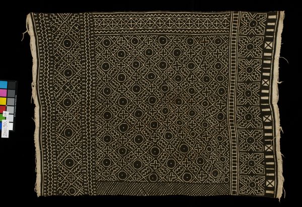 Editor: Here we have the "Hunter shirt," a mixed media textile, the exact date is unknown. It is made of woven cotton with bold geometric patterns, giving off quite a structured and rhythmic feeling. What do you see in this piece beyond its aesthetic appeal? Curator: It's a potent visual statement, isn’t it? When I look at this, I see layers of cultural meaning interwoven into the very fabric. What do you make of the term ‘hunter shirt?’ What connotations does it bring to mind? Editor: The name "hunter shirt" evokes the idea of a protector and a provider but the repeated pattern has something protective but also repetitive and even decorative... Curator: Precisely. And consider this within the context of African art history. The use of geometric patterns isn't just decorative; it's often symbolic, encoding complex social, religious, and historical narratives. These textiles were frequently worn during rituals or significant social events. Editor: So, the act of wearing the shirt becomes a performative act of identity and storytelling? Curator: Absolutely. The shirt transforms the wearer, connecting them to their heritage and community, signaling their role and status. The repetition can reflect cultural continuity and the endurance of tradition against colonial powers. How do you think this garment functions as both a cultural artifact and a piece of art? Editor: Well, on the one hand, it serves a functional purpose but then transcends this practicality through its elaborate design, inviting contemplation. Curator: And it's this tension between function and artistry, tradition, and individuality that makes it so compelling, inviting dialogue about history, culture, and identity. I learned new nuances thinking about this piece with you! Editor: Likewise! Looking at it with a focus on its broader societal role definitely made me rethink what art can be.