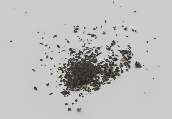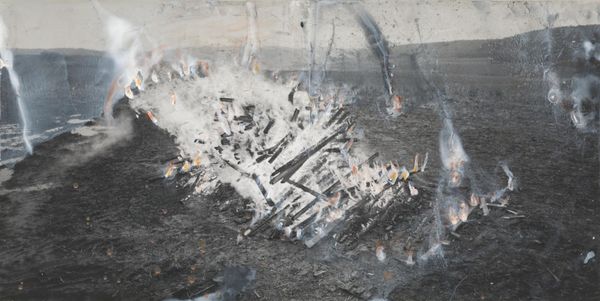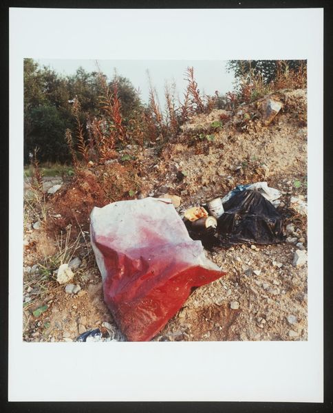 Here we see a photograph by Keith Arnatt entitled "Pictures from a Rubbish Tip." The photograph presents a collection of discarded organic materials arranged on what appears to be a sheet of crumpled plastic, set against a background with a horizontal red stripe. The composition is a scattering of decaying food, scraps and pods, their forms soft and dissolving, suggesting the ravages of time and entropy. Arnatt's choice of subject matter confronts our notions of beauty, challenging conventional aesthetic values. By placing the abject – that which is typically discarded – in the formal context of a photograph, Arnatt asks us to reconsider our perceptions of value and disgust. There is a semiotic play at work here; waste becomes a signifier of consumption and excess. Ultimately, Arnatt’s formal composition, although seemingly random, functions as a mirror, reflecting back at us the uncomfortable truths about our relationship to the material world and the waste we produce.