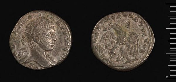 Curator: Here we have a Tetradrachm, a coin, created by Ptolemy VI Philometor. Its weight is about 13.91 grams. The artistry is striking, even on such a small scale. Editor: My first impression is one of power, strangely enough. The metal is worn, but those strong profiles—a ruler and a bird of prey—still speak volumes about authority. Curator: Absolutely. The eagle, a common symbol of power in many cultures, is particularly emphasized here. But it's not just power; it also carries the weight of Egyptian cultural memory. Editor: I agree. And it's important to remember that these images weren't just symbols of authority; they were actively used to legitimize rule, often through associating the ruler with divine power. Curator: It's a fascinating example of how a single image can carry so much symbolic weight across centuries. Editor: Indeed, thinking about the coin's material and the messages it carries, its cultural and economic life, allows me to see it as something more than just an artifact of the past.