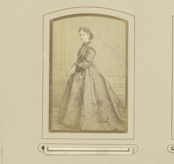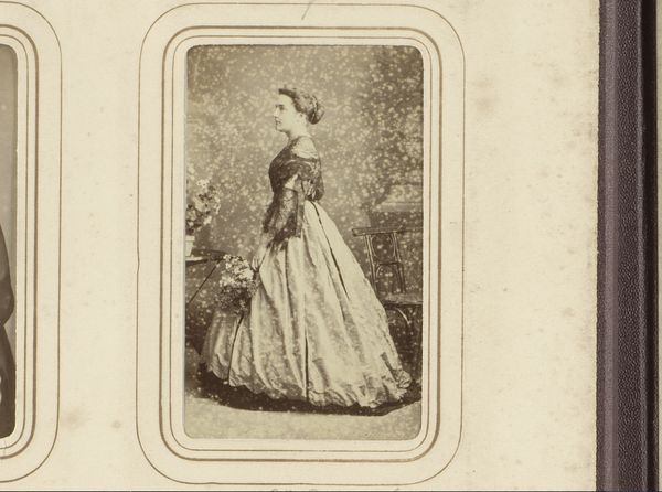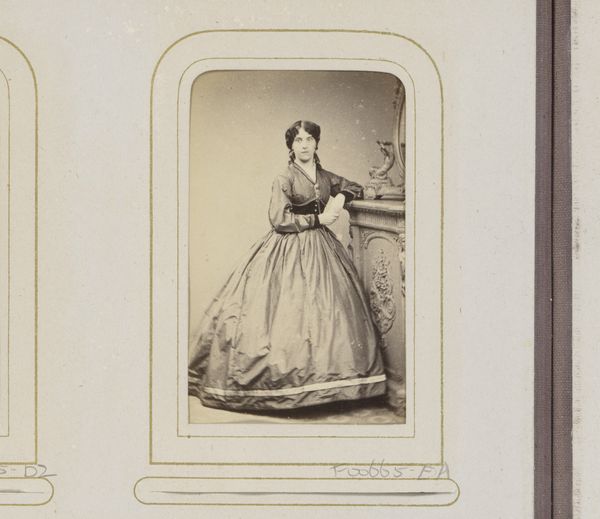 Curator: Standing before us is a gelatin silver print entitled "Portret van een vrouw met waaier", dating back to the 1860s-1870s, credited to José Maria Blanco Aguilar. Editor: She appears to have a severe, stoic look. And those formal, elaborate garments! She almost appears like a monument; a photograph rendering her in stone. Curator: Gelatin silver prints like this one became more common during that era, providing a clearer image and finer detail compared to earlier photographic processes. This allowed for greater nuance in portraiture, solidifying photography's use in establishing a public role in commemorating individuals from society. Editor: And look at how meticulously staged this feels. The faux outdoor backdrop, the rope next to her... the hand fan she holds. They all project her supposed ideal life to her viewing audience and establish the subject's role within her social status. One questions her own narrative outside these markers. Curator: That fan itself, it’s small but noticeable and could very well be symbolic. Beyond providing the owner with a simple physical benefit, hand fans such as that one denoted both status and also restraint. Perhaps it can also function as an early influencer-style photograph. Editor: Yes, I wonder about her agency. Is this her choice to be presented this way, or a societal imposition? Photography back then wasn't truly democratic, with subjects that didn't have money to throw around. Curator: Agreed, these were typically members of the upper class—which makes this photograph a cultural record of that era, too, providing valuable insight to the mores and values, if only to the privileged minority. Editor: Looking at her today allows us to acknowledge our very current privilege of documenting our own lives more democratically; if that’s any concession to modern culture. But without this glimpse, who knows whether we would consider our advantages within our present age? Curator: It certainly serves as a compelling example of the kind of portraiture produced for those seeking representation through artifice back in that historical moment. Editor: A vital look at identity then, versus now.