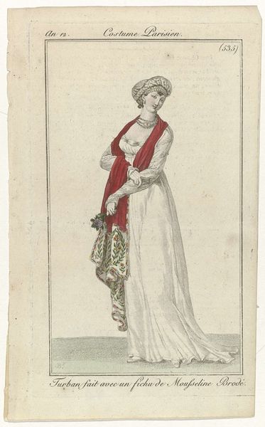 Editor: This print, titled "Collection consacrée aux modes d'hommes et de femmes, 1783-1813, No. 178 : La tendre Aglaé...", presents a woman in a high-waisted dress. The colors are delicate, almost faded. How do you interpret this work? Curator: The material realities of this image are compelling. We see the fusion of “high” art, in the form of idealized neoclassical aesthetics, with the “lowly” world of fashion and print production. Notice the inscription referring to the publisher. It underscores the commercial aspect of circulating these images—feeding consumer demand for the latest trends. Consider also, the labor involved, from papermaking to the inking of the press. What might all this suggest about the broader social and economic landscape of the time? Editor: So, you're saying it's not just about the pretty dress but also the system that produced and consumed it? Curator: Exactly! The “Greek robe,” while seemingly timeless, was actually a product of specific manufacturing techniques, markets, and social desires. Examining the dress through a materialist lens asks us to consider the labor, consumption, and even exploitation woven into its very fabric. What was the ecological cost of producing paper in the 18th century, for example? Editor: That is a great perspective, and one that hadn't crossed my mind when viewing the artwork from an aesthetic point of view! Now I wonder about the work environment of those involved in making these prints... Curator: Precisely! Thinking about the processes opens up new avenues for understanding art and its place in society.