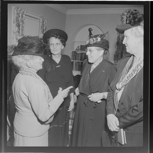 Curator: Jack Gould’s small photograph, “Untitled (elderly women at meeting in house),” offers us a glimpse into a seemingly private gathering. The composition, with its stark black and white tones, immediately strikes me as quite severe. Editor: It feels like a study in contrasts, doesn’t it? The dark dresses against the patterned wallpaper, the formality of the hats against the domestic setting, it hints at social structures and perhaps even unspoken rules within this group. Curator: Indeed, the tonal range emphasizes the geometry of the scene—the strong verticals of the window frame, juxtaposed with the softer curves of the lamp and piano. The artist's attention to light and shadow creates a certain tension. Editor: I wonder what the context of this meeting might be. Were women's clubs or charitable organizations central to community life at the time this photograph was taken? This image reflects an era where such gatherings played significant social roles. Curator: Regardless of the specific occasion, the formal arrangement and contrasting tones contribute to the image’s aesthetic power, revealing the artist’s command of visual language and composition. Editor: I agree. It's a fascinating intersection of social history and formal construction.