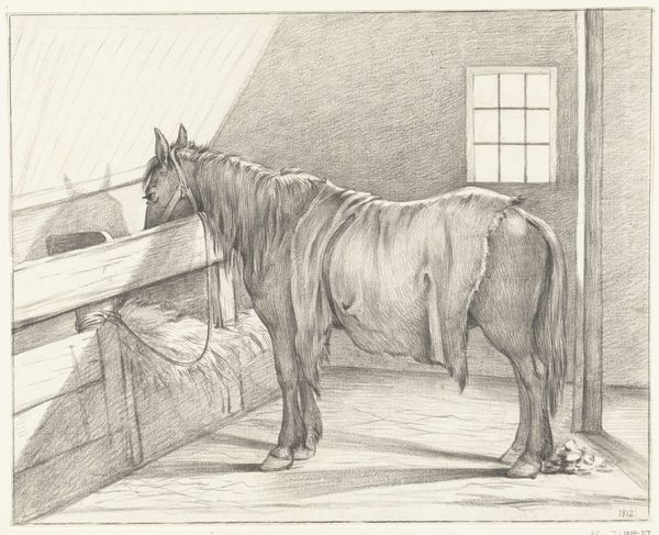 Editor: Here we have Jean Bernard's "Standing Horse in a Stable, Facing Left," created in 1817, using pencil as the primary medium. It feels so serene and calm; the horse appears almost melancholic. How do you interpret this work? Curator: I'm immediately drawn to the interplay of light and shadow that Bernard meticulously crafts with his pencil. Notice how the texture of the horse’s coat is defined not just by line, but also by subtle variations in tone. Consider, too, the use of negative space; how does it shape our perception of the subject? Editor: The use of shadow really does give a sense of depth. The lines forming the hay create the same effect, in a different way, because they're so tightly packed together. Curator: Precisely. And what about the composition? The positioning of the horse relative to the stable post... What effect does this have? The post bisects the image vertically. Editor: Well, the post creates an interesting division, doesn’t it? It almost traps the horse, heightening the sense of stillness that I first felt. Perhaps this communicates a subtle tension between freedom and confinement? Curator: A perceptive observation. The structural elements invite precisely this kind of layered reading. How would you describe the handling of line throughout the composition? Editor: The linework varies quite a bit—more delicate on the horse’s face and thicker, more assertive strokes for the post and hay. It definitely directs my eye to the focal point: the horse itself. It's clear form is important. Curator: Indeed, Bernard uses the formal qualities of the drawing to communicate meaning beyond just representation. It becomes an essay on form itself, and on how varying the density of line impacts the viewer's attention. Editor: It is like he is studying the relationship of dark and light with pencil, the same way painters play with colour. I now understand that form can be both a subject and a tool. Thanks for the clarification!