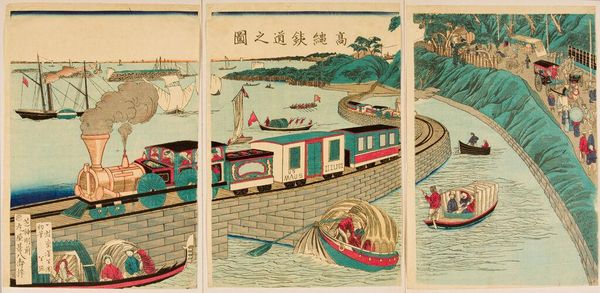 Curator: This is a woodblock print by Adachi Ginkō, titled "Rules for the Department of Young Ladies." Editor: It feels like two worlds stacked on top of each other, doesn't it? The floating world above, and a more grounded, interior space below. Curator: Indeed. Ginkō, active in the late 19th century, often depicted contemporary social mores. This piece contrasts leisure with education, showing young women in different settings. Editor: The upper scene, with the women on the boat, feels carefree. The lower one has more rigid poses, and the objects seem to be symbols. Are they following rules? Curator: Precisely. The text panels likely detail expected behaviors. The lower scene, with the ladies indoors, performing tasks, underscores discipline and social expectations. Editor: So, the boat is a symbol of freedom, and the interior is about the constraints of societal expectations. Curator: Perhaps. What's fascinating is how Ginkō uses these visual contrasts to subtly comment on the position of women at the time. Editor: It's a visually striking composition for a fairly complex subject. I'll definitely be pondering the symbolic weight of that boat for some time.