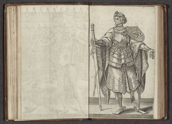 Editor: Here we have Hendrick Goltzius's 1584 engraving, "Kings Richard II, Henry IV, Henry V, and Henry VI." The figures, each bearing a sword and shield, look pretty severe. What stands out to you about this piece? Curator: Well, immediately, I'm drawn to how Goltzius positions these kings not just as rulers but as representations of power in a deeply gendered and classed society. This was a period grappling with national identity, right? How are these figures being constructed and consumed in relation to that context? Notice their poses, the attire... it speaks to a very specific performance of masculinity and authority, doesn't it? Editor: It does. I’m also struck by how similar they look. I wonder if that sameness suggests something about the artist’s views on monarchy in general? Curator: Precisely! Think about the symbolic weight of those crowns and shields. Heraldry was so closely tied to lineage and the perceived right to rule. How do we decode those symbols, understanding that their meanings were constantly being negotiated and often contested during this period of religious and political upheaval? Editor: So it's less about a straightforward celebration of kingship and more about interrogating its very foundations? Curator: Absolutely! Goltzius wasn't just passively depicting royalty, but actively engaging with complex debates about legitimacy and representation. Consider how this print might have been used, circulated, interpreted differently by diverse audiences. This is more than just a historical portrait; it’s a potent piece of propaganda reflecting a very specific sociopolitical moment. Editor: That's fascinating. I hadn't considered how actively involved Goltzius might have been in these political debates. Curator: Seeing it this way helps us understand how art, even historical portraits, is always entangled with power dynamics and social narratives. What we learn from this image teaches us so much more!