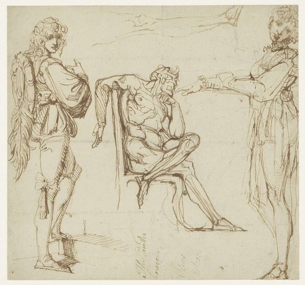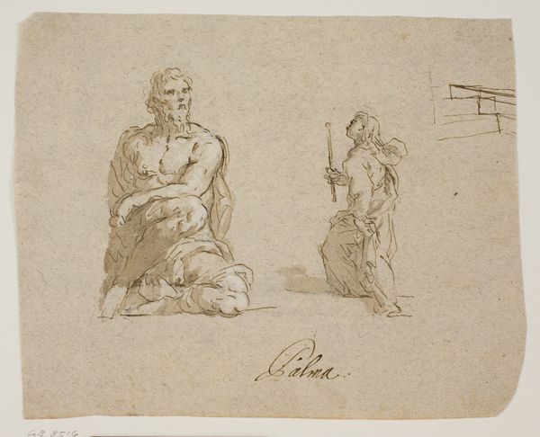 Editor: This drawing, "Amnon and Tamar" by Guercino, created in 1649, is rendered in ink on paper. The raw, expressive lines convey such tension. What do you make of the choices Guercino made? Curator: Indeed. Notice how the figures are only partially described, almost emerging from a space of suggestion rather than definitive form. Think of the story of Amnon and Tamar from the Book of Samuel. Guercino captures that narrative's deep psychological impact through his use of symbolism. Tamar's averted gaze and Amnon's strained posture are not simply visual details. They are indices of guilt and violation deeply ingrained in our collective cultural memory. What do these body postures communicate to you? Editor: I see their struggle. Amnon’s physical dominance contrasts with Tamar’s cowering stance. It's a powerful depiction of vulnerability. Curator: Precisely. The symbols Guercino uses aren’t overt; instead, they reside in the subtle language of gesture and expression. The unfinished quality of the drawing is crucial, don't you think? Editor: Definitely, it mirrors the incompleteness, the irreparable damage, done to Tamar. Curator: And also the enduring cultural stain of such acts. Guercino forces us to confront uncomfortable truths about power and its abuse, which remain disturbingly relevant centuries later. It reminds us that such wounds, both personal and societal, leave lingering marks. Editor: It's interesting to consider how Guercino’s work invites continued contemplation about the representation and remembrance of trauma. I hadn’t initially considered that it speaks to wider cultural issues. Curator: These images become powerful precisely because they carry layered meanings, shaped by historical context, personal experiences, and the enduring power of symbols.