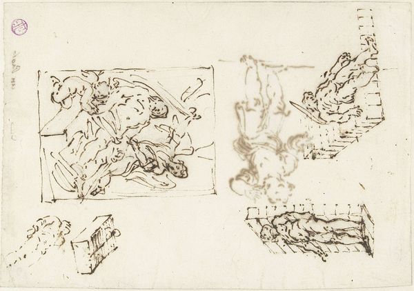 This sheet of studies was made by John Flaxman, probably in the late 18th or early 19th century, using graphite on paper. The effect of graphite on paper is one of immediacy. It's a direct, accessible medium, capable of capturing the fleeting nature of an idea. Look closely, and you'll notice the varying pressure of the artist’s hand. Some lines are bold and assertive, others barely a whisper on the page. This allows for a sense of depth and volume, despite the two-dimensional nature of the drawing. The ease of graphite allows for the rapid generation of ideas, moving from one to the next. There is a sense of freedom. The act of drawing here becomes a form of thinking, a way of working through ideas, and in the process, challenging the hierarchy between finished artwork and preliminary sketch.