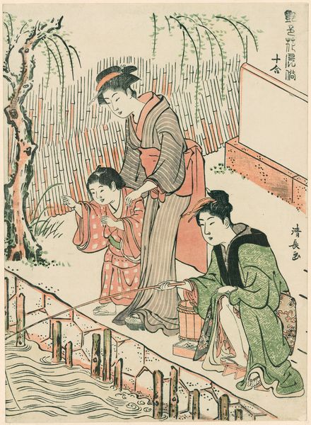 Editor: This is Torii Kiyonaga's "Takata, from the series "Ten Summer Scenes in Edo," made around 1787, a woodblock print at the Art Institute of Chicago. I'm struck by the everyday quality of the scene, and by how the linear elements contrast with the patterned robes. What captures your attention when you look at this work? Curator: I'm drawn to the way the woodblock printing process itself informs the subject. Consider the labor involved, not only by Kiyonaga but also the artisans cutting the blocks and applying the pigments. This was commercial art intended for a burgeoning urban consumer class. How does its status as a commodity shape our understanding of Edo society? Editor: That's fascinating. I hadn't really considered the printmaking process beyond just the image itself. So the materials, the woodblocks, and the ink, they speak to more than just aesthetics? Curator: Absolutely. The materiality speaks volumes about the social context. Think about the availability of these prints: they were affordable, mass-produced images accessible to a wider audience than traditional painting. This also blurs the line between "high art" and commercial craft. How does the ease of reproduction democratize art or simply transform it into a disposable commodity? Editor: It definitely makes me rethink ukiyo-e beyond just pretty pictures. Is there something particularly significant about the way Kiyonaga depicts leisure and the daily lives of women? Curator: Certainly. The prints themselves were made through labor to show leisure, purchased to observe women's fashion of the moment; Kiyonaga's delicate and precise style, dependent upon skilled craftsmanship, provided an illusion of serene refinement. Editor: That’s given me so much to consider – that this image is only the surface of a complex production process. I see so much more now than I did at first glance. Curator: Indeed! Recognizing the interplay between artistic vision, production methods, and social consumption deepens our understanding of this seemingly simple scene.