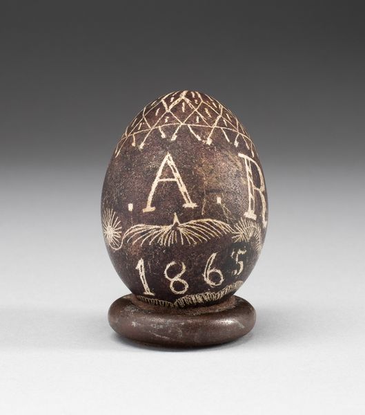 Editor: Here we have the *Egg* still bank, dating to around the mid-20th century. It's a ceramic sculpture, attributed to Banthrico, Inc. I’m immediately drawn to its texture and the way the reddish-brown ceramic catches the light. What do you see in this quirky piece? Curator: Quirky is definitely the word! It's got this curious blend of classical figures—look at the vaguely Greek goddesses—combined with this very modern (for the time) idea of saving money. Almost feels like they are bestowing some sort of ancient blessing on our…financial responsibility? And, the egg shape itself, what does that evoke for you? Editor: I suppose the egg symbolizes potential, like, the potential for wealth? It also feels quite decorative, rather than something functional. Curator: Precisely. I mean, it’s a bank, right? Designed for function. But then the Banthrico artists sculpted these really intricate designs and what do you call it, giving this object the touch of fine art! It asks: can everyday objects be elevated? Editor: I never thought of a bank as a cultural artifact! The detail is quite impressive, when you think about it holding coins. Curator: Indeed! And those goddesses, protectors of wealth, presiding over your hard-earned pennies. It’s a funny contradiction of high and low art and utility isn’t it? It's a beautiful example of how even the most mundane things can carry surprisingly rich layers of meaning and clever artistry. Editor: Definitely something to ponder as I deposit my next paycheck. Thanks for shining a light on the Banthrico's intentions. Curator: My pleasure! Makes you look at your piggy bank differently, eh?