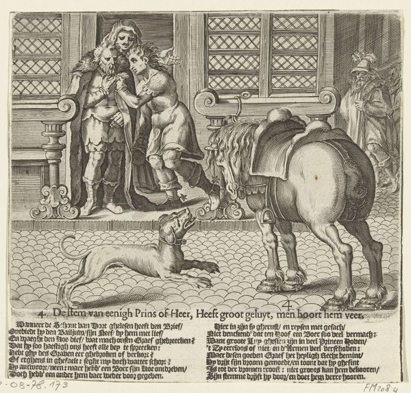 Editor: This is Antonio Tempesta's "Circe Changing Ulysses' Men to Swine," a small etching. It feels incredibly theatrical, but also a little disturbing. What symbols do you see at play here? Curator: The transformation itself is a potent symbol. Notice how Tempesta retains elements of their former humanity – armor, posture – even as they become swine. What does this suggest about the relationship between outward appearance and inner nature? Editor: It’s like the armor is a façade, and Circe is revealing their true, base selves? Curator: Precisely! The cup she offers isn't just a potion; it's a test, a revelation. Consider the enduring power of this image. It speaks to our anxieties about control, bestial urges, and the deceptive nature of appearances, doesn’t it? Editor: Absolutely. I'll definitely look at classical stories differently now. Curator: Indeed. It's a stark reminder that images carry layered meanings across time.