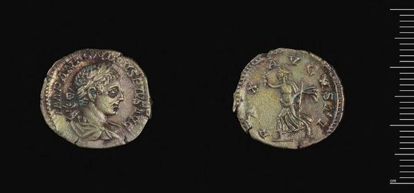 Curator: Here we have a silver denarius of Caracalla, a Roman emperor who ruled in the early 3rd century. What catches your eye first about this little piece of history? Editor: The weight of it—literal and figurative. It's a tiny thing, just over 3 grams, yet it's brimming with an emperor's ego and the symbolism of power. It feels strangely potent, no? Curator: Absolutely. The portrait, although small, embodies the idea of Imperial authority. We see the laurel wreath, a symbol of victory and status, reinforcing Caracalla's image. Editor: And then the figure on the reverse. Is that meant to be Caracalla as well, dressed as a soldier or perhaps representing a military virtue? The spear and short tunic speak volumes. Curator: Indeed. It's a representation of military might, of course, but also a claim to legitimacy and strength at a time of internal conflict. It projects an image, despite the turmoil. Editor: It's amazing how much narrative can be packed into such a small, everyday object. A coin wasn't just money; it was propaganda, a portable symbol of Roman identity and power. I guess that's why it's so captivating. Curator: Exactly. It's a glimpse into the past—the ambition, the anxieties, and the visual language they used to communicate it all. A tangible touchpoint with an ancient world. Editor: It's like holding a whisper from the past, a reminder that even empires are built on fleeting images and the stories we tell ourselves.