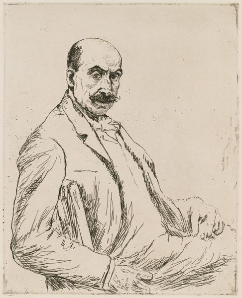 Curator: Here we have a portrait etching titled "Rudyard Kipling" by William Strang. Editor: Oh, interesting choice! My first thought? Impatient intellect. Look at those crossed arms—he's got thoughts churning faster than he can speak them. You know that kind of contained energy? Curator: Strang made quite a few portraits like this; he was tapping into the booming market for representations of literary and artistic figures. Intaglio prints allowed these images to be disseminated widely, shaping the public's perception of Kipling. Editor: It feels…staged. The light catching the spectacles, the meticulous rendering of the moustache... But not necessarily in a bad way. It almost reads as performative—Kipling knowingly embodying the role of the intellectual man of letters for his audience. Is this a critique? A tribute? I’m honestly not sure. Curator: Strang and Kipling were contemporaries navigating complex social and political terrain. Kipling, the imperialist poet, was becoming a problematic figure as attitudes toward empire shifted. Editor: Right! The glasses create a sort of reflective barrier. There's something subtly confrontational there. What's he really seeing, and what does he want us to see? The etching technique definitely lends itself to a crispness that is in part why the overall work resonates today, given that it evokes both the familiar yet ambiguous qualities of Kipling, both in visual composition as well as character of the figure that occupies the portrait. Curator: Exactly, and this piece reflects that ambivalence that came to encompass both the subject, and his impact in a global view of history. Editor: Well, now I'm definitely feeling a shift toward critique. It's a nuanced comment, like a well-placed jab in a literary argument. Very fitting for a figure of this time. Curator: Indeed. Thanks for those thoughtful observations. They really illuminate the context surrounding both Kipling, and how the very act of being represented shapes one's public image.