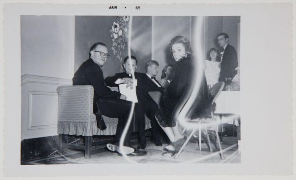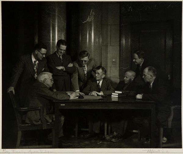 Editor: This photograph, titled "Untitled (group conversing)" by Joseph Woodson Whitesell, presents a scene with people gathered in what appears to be a dimly lit room. It's the materiality of the image itself that strikes me – the graininess, the contrast. What can you tell me about this piece? Curator: I see the materiality of image production defining this photographic work. This image prompts questions about the means of representation, the role of labor in capturing this moment, and the social context of the subjects. How does the method of production itself impact the meaning we derive from the photograph? Editor: I hadn’t thought of it that way. So, you're suggesting that the way the image was created influences how we understand the conversation taking place? Curator: Precisely. The materiality of the photograph – the paper, the chemicals, the darkroom processes – all contribute to the final product and its reception. By considering these aspects, we shift our focus from just the subject matter to the conditions of its making. Editor: That's a really interesting way to approach it. I'll definitely be considering the materials more consciously from now on.