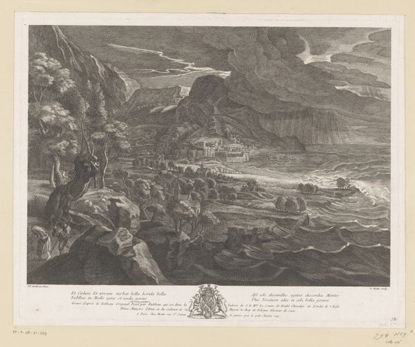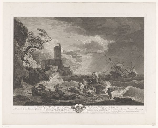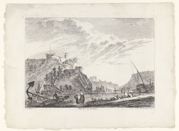 Curator: The fine lines of John Pye's engraving, created between 1773 and 1779, depict "Gezicht op Europa Point, Gibraltar." There’s a rather theatrical feel to it. Editor: Absolutely. There’s something almost melancholy in the muted greyscale; like a stage set prepared for a drama about colonialism and military occupation. Curator: In terms of symbolic representation, Gibraltar has historically represented ideas of military strength and the reach of empires, particularly Britain's maritime power. It’s interesting how Pye captures this sense of power, almost through absence; we only see the architecture on the cliffs, and suggested maritime activity in the boats at the shoreline. Editor: It really speaks to the tension between the picturesque beauty and the implied violence. It’s so characteristic of the baroque era to contain multiple narrative strands within a single frame, almost contradicting each other, I would say. The light creates an emotional feeling for the land itself. Curator: It almost feels like we’re viewing a historical record and a myth simultaneously. Do you find the stark contrasts between light and shadow evoke specific feelings for you? Editor: Definitely. I see the deep shadows near the rock face and they make me wonder about the local populations who undoubtedly experienced this landscape in very different terms than the colonial figures suggested by those buildings above. The visual hierarchy puts their stories in the shadows, which makes the work implicitly about power and perspective. The human activity almost blends into the earth that is beneath their feet; are we merely transient here? Curator: That interpretation brings such contemporary concerns into dialogue with historical modes of seeing. And yes, it does evoke a sense of power; but it makes me think about the passage of time—the sense that we are viewing the landscape at this moment. Editor: The layering in this image asks us to be critical about whose perspective dominates the historical narrative and encourages to remember there are always hidden or unacknowledged narratives within the dominant representations of place.