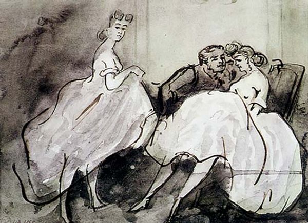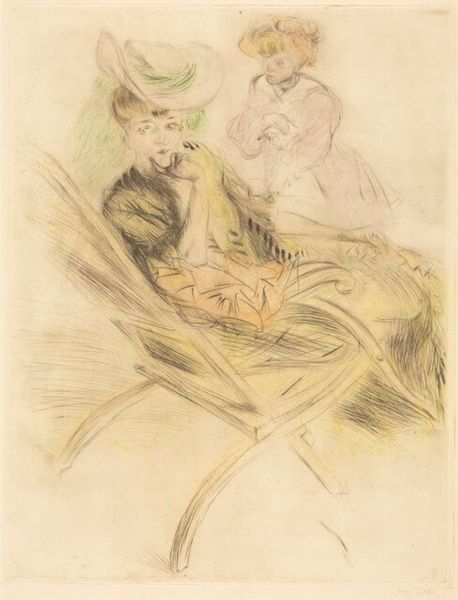 Henri de Toulouse-Lautrec made this drawing of The Goulue and Valentin, The Boneless One, using pencil or crayon on paper. It is a loose sketch that captures the essence of the famous cabaret dancers. The artist's choice of materials and techniques underscores the fleeting nature of the Parisian nightlife he depicted. This approach to mark-making isn't about refinement or permanence, but rather about capturing the energy of a scene, of the dancers, and the atmosphere of the Moulin Rouge. The textured paper adds a tactile quality to the image. The sketchy lines and the visible strokes of the artist's hand remind us of the labor and artistic skill involved in creating this drawing. It is a document of a specific time and place, encapsulating the spirit of a society undergoing rapid change. Considering the materials, the mark making, and the social context allows us to understand the drawing not just as a representation, but as a physical manifestation of a moment in time, blurring the lines between fine art, illustration, and social commentary.