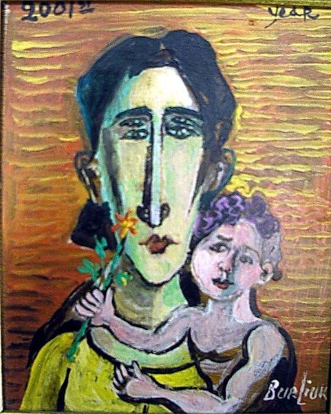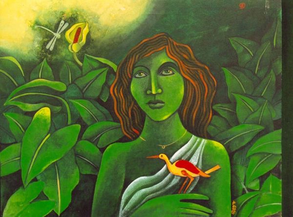 Jahar Dasgupta created this painting of ‘Mother and Child’ with colours that dominate in lush greens, accented by earthy oranges. These colour choices evoke a feeling of nature and growth. The figures are stylized with elongated features, creating a sense of serenity. The composition places the mother and child close together, suggesting intimacy. This is reinforced by the figures' arms, which gently embrace in an expression of affection. The artwork challenges traditional representations of motherhood. Instead of realistic depiction, Dasgupta emphasizes the geometric and abstract, thereby moving beyond conventional sentimental portrayals. This formal reduction allows the artist to explore the essential structure of the relationship. Ultimately, the work invites us to consider how the formal elements, and the interplay of colour, shape, and composition work together to create meaning and challenge our perceptions.