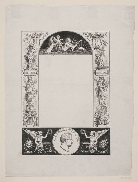 This is Albrecht Dürer's "Design for a Title Page with Ornamental Border and Coat of Arms of Willibald Pirckheimer," an intricate black ink drawing. The composition immediately presents us with a study in contrasts. The central rectangle offers a stark, empty space, compelling our gaze outward to the elaborate ornamental border, teeming with symbolic figures and motifs. Note the two cherubs at the bottom, holding Pirckheimer's coat of arms with its stylized tree. Above, the arrangement of classical columns, grotesque masks, and lush foliage creates a space dense with visual information. Dürer masterfully employs the semiotic language of the Renaissance, blending classical and humanist elements to honor Pirckheimer, a prominent humanist scholar. The stark white of the central void, framed by such detailed imagery, destabilizes any fixed interpretation, instead posing questions about the relationship between text and image, ornament and meaning. The drawing challenges us to consider how such visual structures contribute to the construction of knowledge and power.