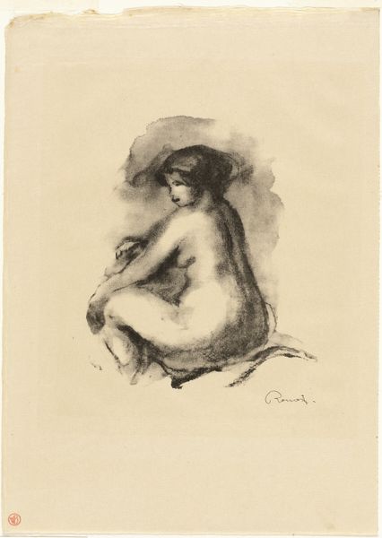 Editor: So here we have "Zittende Vrouw," or "Seated Woman," by Nicolaas van der Waay, sometime between 1865 and 1936. It’s a graphite or pencil drawing, and I'm immediately struck by how vulnerable the sitter appears. It feels like a very private moment. What do you see in this piece? Curator: The averted gaze, the clasped hands... Indeed, there's a carefully constructed sense of intimacy. The draped fabric, while offering a degree of modesty, simultaneously draws attention to the exposed form. Consider the loaded symbolism: what does it evoke when an artist chooses to portray a female figure in this state of undress? Editor: I guess it depends. It feels like she's more self-possessed than sexualized, but I see how it could read either way depending on your own associations. The draped fabric reminds me of classical depictions of goddesses, maybe Venus. Curator: Exactly! The drapery acts as a visual echo, consciously or unconsciously recalling those historical depictions. And the fact it is a drawing adds another dimension to that vulnerability you identified. What's absent is as important as what's present. Van der Waay invites us to complete the narrative. What emotional narratives, linked to art history or psychology, might it conjure? Editor: Maybe it is about contemplation then – like the woman is drawing power from within. Seeing that connection to classical goddesses definitely makes me think differently. Curator: Precisely. And consider the lasting power of the “seated woman” across time – from ancient sculptures to contemporary photography, the symbol and meaning endure through changing artistic styles. What a subtle dialogue across the ages Van der Waay created! Editor: It’s fascinating how much complexity can be communicated with a simple sketch. Thank you for sharing your insights!