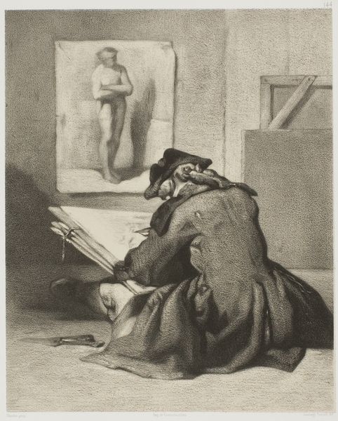 Curator: This artwork by Francisco de Goya is titled "A Scene from The Forcibly Bewitched". Look at how effectively he uses oil paint. The texture almost becomes part of the scene, don't you think? Editor: My first impression? Unease. There's a nervous tension that radiates from the figure. I think it’s created, partly, by the limited color palette and dramatic contrast between light and dark, but what is he pouring into the lamp? Curator: Absolutely, the contrast amplifies the mystery. It depicts a ritual. Notice the figure holding what appears to be a pot, possibly for burning incense or something stronger. But more strikingly, the figure seems to be making offerings to a satyr-like figure. It all evokes images of folklore, superstition, and maybe social critique, that may speak about manipulation and its price, for the person conducting and being subjected to bewitchment, in turn, like two sides of a coin. Editor: I wonder what sort of pigments Goya employed to achieve that smoky, unsettling atmosphere. Considering Goya's era, were they locally sourced or did he rely on international trade for his palette? That affects cost, which in turn impacts who can even make such things. Is there arsenic involved, or mercury, materials we now regard differently from a making perspective, yet have indelibly marked culture with both practical and allegorical properties? And, too, is the use of oil itself – how much does that contribute to this particular look and affect we’re getting from Goya? Curator: Fascinating points, surely deserving more technical scrutiny. The composition itself invites reflection: notice how Goya arranged the other phantom-like figures of donkeys in the background, symbols that might speak of irrationality, or even of being led to absurdity, like passive and foolish people usually were figured? Editor: And the social commentary comes through. Donkey-headed spectres. I bet that had impact! Who was funding this work? Did their economic and social status afford Goya a measure of subversive expression through his chosen materials and means? Curator: I think his patrons may have understood, at least partially, the satirical edge. What persists is the stark portrayal of a scene charged with ambiguous meaning; a scene from which you get, with a careful eye, a disquieting resonance about cultural continuity and social criticism, as the painting, literally, brings those narratives into light. Editor: Ultimately it all boils down to who had the means to translate stories and shape perceptions through skilled manipulation of available stuff. I find the act of transforming cheap stuff into cultural products just, well, deeply resonant.