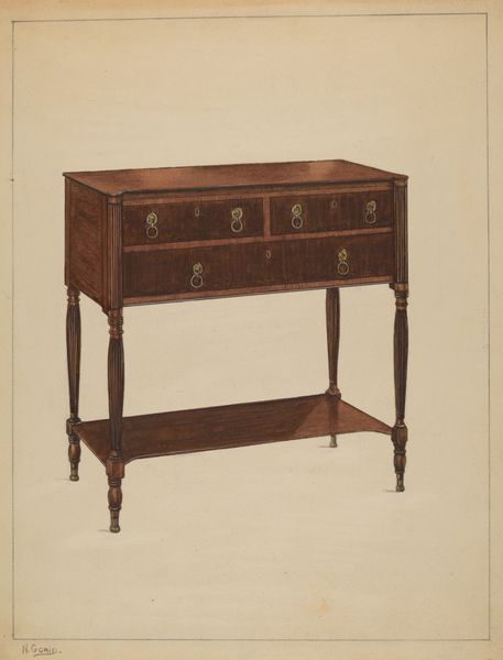 Louis Annino's "Lowboy," of indeterminate date, presents a detailed study in watercolor, focusing our attention on the form and materiality of a classic furniture piece. The reddish-brown wood, rendered with careful shading, immediately conveys a sense of warmth. Annino meticulously captures the structure of the lowboy, breaking it down into its essential geometric forms. The drawers, with their brass pulls, create a horizontal rhythm against the cabriole legs, which introduce a dynamic, curvilinear element. The fan-shaped carving disrupts the regularity of the drawers, suggesting an interest in disrupting the formal expectations of the piece. Through his focus on form and detail, Annino invites us to consider how we perceive and categorize familiar objects. The artwork functions not just as a depiction but as a lens through which we can analyze the interplay between form and function, structure and ornament. The clean execution prompts ongoing interpretation about how the traditional and the modern intersect.