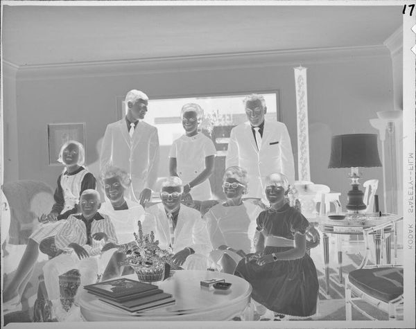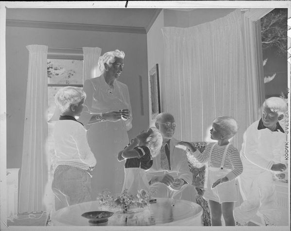Curator: Here we have an intriguing photograph from the Harvard Art Museums, an Untitled family portrait in front of a fireplace by Lucian and Mary Brown. It measures about 10 by 12 centimeters. Editor: It's striking, this negative image. There's an almost unsettling quality, yet also a strange warmth emanating from the poses and composition. Curator: I'm drawn to the materiality of the image, the photographic process itself. What type of film was used? How were the subjects positioned in relation to the light sources? These details tell us about the artists' working methods. Editor: Indeed, and the subjects' clothing and setting—the piano, the books—speak to a particular class and era. What stories do their expressions tell us about identity and family dynamics within that social context? Curator: Absolutely. And by understanding the means of production, we gain insight into the social and economic structures that enabled this image to exist in the first place. Editor: It's a reminder that even seemingly simple family portraits are deeply embedded in complex histories of representation and power. This image challenges us to look beneath the surface. Curator: I agree. It offers layers of understanding, from the physical properties of the photograph to the broader social narratives it reflects. Editor: A compelling piece that reveals much about the art of image-making and society.