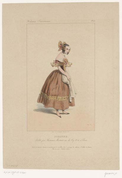 Curator: This watercolour drawing, dating back to around 1870, is called 'Soubrette' and is by the artist Bertall. Editor: There’s an immediate charm. The way the light washes over her, that subtle blush—it's like a fleeting, almost secretive moment captured. It gives her a delicate air. Curator: Bertall, a 19th-century French caricaturist, was adept at capturing social types of the period. The "soubrette" itself was a common stock character—a cunning, flirtatious maid or servant girl. This illustration invites us to examine those gendered roles that dominated society. What is she grasping there? Editor: Is that a letter? Her slightly turned head and outstretched arm, as if presenting something, evoke questions about communication, female agency, perhaps even forbidden liaisons of the era. I’m curious what she has to say. What impact is she having within the narrative implied? Curator: The sketch is indicative of its time, referencing theatre and romanticism, presenting this almost-generic representation of female adolescence. Her clothes immediately give a sense of her station in life, an illustration not just of someone but something... perhaps a representation of youth, longing, and the power dynamics present within social strata. The rose at the centre of her bodice is an interesting point to focus on. Editor: True. And note how Bertall's watercolor and pencil work are light, creating almost a dreamy, fairytale-like quality, a gentle image with social cues. Is she a tool or an actor in the politics of the era, and how does the sketch comment on it, and make us think today? Curator: Bertall captures not just a single girl but also a historical concept, a mirror reflecting attitudes and power structures of the nineteenth century that in certain senses continue to exist to this day. Editor: This conversation has transformed my first impression into something richer. What looked initially as mere charm now also suggests nuanced layers of historical female experience and social expectation.