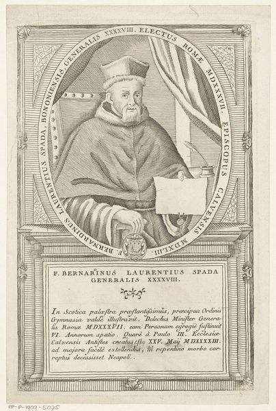 Curator: This engraving presents a portrait of Miguel Masserotti, 66th Minister General of the Franciscan Order. It's dated sometime between 1710 and 1738 and made by Antonio Luciani. Editor: The overwhelming feeling I get is…institutional. Everything seems so tightly controlled in its representation, from the stiff pose to the meticulously etched lines of his robes. What exactly do you think it's made from? Curator: It's a print, so we’re looking at the mechanical reproduction and distribution of imagery in the service of promoting someone important. The artist would have started with a metal plate, carving the image using various tools and acids, it's all part of a commercial artistic enterprise. Editor: That commercial element really emphasizes the intended audience, then, doesn't it? This isn't just art for art's sake; it's designed to project authority and convey Masserotti's status to a broad viewership. Notice the elaborate cartouche and the Latin text celebrating Masserotti's titles! Curator: Absolutely. Think about the workshops involved. Someone is preparing the printing plate, others pulling prints, distributors getting it into circulation—there's labor connected to the image. Also the use of engraving as a technique – a signifier of prestige and skilled craftwork. Editor: It definitely tells us something about power dynamics and image control during that era. It seems interesting that the written descriptions of Masserotti include not just religious accolades, but reference to "heretics"... what does this artwork do, visually or materially, to assert a counter position? Curator: Well, this image becomes part of a wider visual rhetoric within the Church. You know, similar prints would circulate, building up an image, a brand if you will, aligning him within established structures of power. It speaks of this constant production, constant reproduction and reaffimation, too, of religious doctrine through materiality. Editor: Thinking about it this way opens up the print beyond just a portrait, to thinking of it as evidence. The act of producing this image reflects institutional self-regard and preservation. Curator: Exactly, this kind of analysis shifts our focus from the image alone to considering labor and capital that went into making the portrait available. Editor: This piece gives us such a tangible peek into the processes by which authority was constructed and broadcast in early 18th century religious circles.