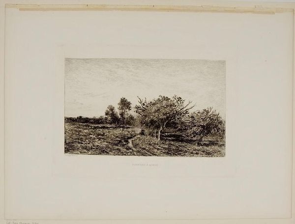 Curator: There’s a quiet intimacy to Charles François Daubigny's “Pasture at Villerville (Calvados).” It feels like a stolen moment. Editor: My first impression is the density of the mark-making—the sheer labor involved in creating that textured foreground and turbulent sky. Curator: It does have that tactile quality, doesn't it? Daubigny was truly masterful at capturing the ephemeral nature of light, air, the very pulse of the French countryside. Editor: It's interesting how Daubigny focuses on the working landscape here. There is a certain amount of labor involved in even the most pastoral settings, don't you think? Curator: Absolutely, the land is breathing, and Daubigny captures that in every etched line. It’s all about feeling the earth beneath your feet. Editor: It's a striking depiction of how labor and land are interconnected. Curator: I always feel transported when I see this piece. Editor: Yes, it's a reminder of the social structures at work, shaping the landscape.