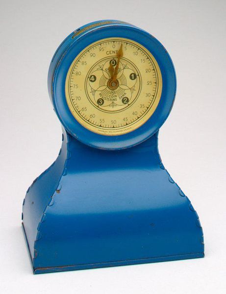 Curator: This is the "Flying Saucer Bank," a mechanical bank made in 1956. It’s an assemblage incorporating metal and pigment, and its maker is Duro Mold and Manufacturing Inc. What's your immediate reaction to it? Editor: It’s…optimistically kitsch! That pastel teal and yellow color scheme immediately signals mid-century utopianism, promising progress and a whimsical view of the future. It feels light-hearted, but I can also sense an undercurrent of anxiety. Curator: The space race was really gaining momentum around this time, wasn't it? So much symbolic weight loaded into this playful object. You've got this hopeful vision of extraterrestrial exploration fused with something deeply mundane: saving money. The symbolism is overt and multi-layered. It seems to be saying: Saving can lift you up into the skies. Editor: Right, it speaks volumes about consumerism and the burgeoning middle class in post-war America. This wasn't just about putting pennies away; it was about buying into the dream—a future filled with technological marvel and material comfort for everyone. Ben Franklin Savings gets a ride into outer space! Curator: Exactly. I think this object perfectly captures the era’s fascination with space travel. In that historical moment, 'geometric' shapes like flying saucers stood as icons of the unknown, symbols of a future full of progress. Yet, the object is not solely aspirational. There's also the darker aspect, I suppose: It's a physical manifestation of collective hopes invested into what might have become 'broken' promises, in many ways. Editor: Absolutely. The bank’s form is fascinating when seen in light of broader cultural anxieties. It taps into both Cold War fears and utopian dreams, where anything seemed possible through technological advancement—and carefully managed finances. Plus, these shades always invoke a heavy undercurrent of cultural assimilation through gendered performance in the form of gender reveal cakes! Curator: Well, what's interesting to me is how such an 'immature' form carries the serious burdens and heavy load of representing and channeling shared expectations. As much as it points toward the future, its purpose points more urgently at present safety. The shape may also point backward toward historical precedents of “technological marvels,” such as naval weaponry and streamlined transportation, which also inspire mixed feelings about social order and governance. Editor: It makes me think of the accessibility of “saving” and which populations that promise of easy growth are marketed toward. What do you walk away with now, thinking about this little machine? Curator: I will never look at another flying saucer without wondering what social compact or anxieties that simple disk design conceals.
