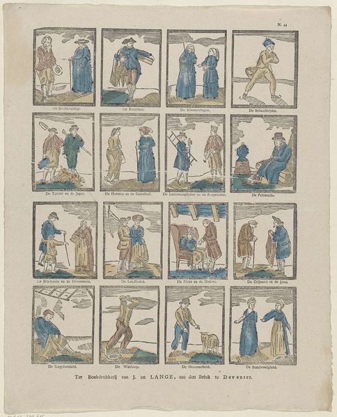 This fascinating print, "Ambachten en beroepen," by I.I. de Lanier, presents a tableau of various trades, each a microcosm of human activity and social order. Consider the motif of the ladder in the first scene: seemingly simple, it's a tool but also a symbol of aspiration and social mobility, a visual echo of Jacob's ladder, linking earthly toil to higher realms. The exchange of goods between figures throughout the panels carries its own weight. It reminds me of similar depictions of commerce in ancient marketplaces, where the act of giving and receiving transcends mere transaction to become a binding social ritual, rooted in reciprocity and trust. Observe the somber tone of the scene where a man hands over a document or money; the body language may betray emotional states linked to notions of gain, loss, and security. How, then, does this archetype resonate across time? We see it mirrored in countless depictions of merchants, tax collectors, or even fateful bargains. In the collective consciousness, such imagery serves as a potent reminder of our universal entanglement within the economy.