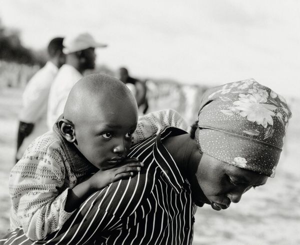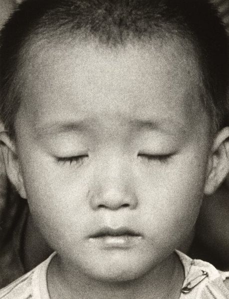 Curator: What strikes me first about this piece is the intense quietude—a sort of concentrated listening. Editor: Indeed. We are looking at a black and white photograph by Fazal Sheikh, taken in 2007. It's titled "Simran, Homeless Shelter, Delhi, India." The subject, a child, is captured in a moment of introspection. The image vibrates with meaning that’s almost hard to put into words. Curator: It feels almost timeless, doesn't it? That monochrome palette strips away the distractions of colour, leaving us with pure form and emotion. I find myself drawn to the soft light, which caresses the contours of the face. I almost want to touch the face! The cropped hair also feels quite iconic—what does that signify for you? Editor: The cropped hair could be interpreted in many ways within the context of homelessness—loss, institutionalization, or even, ironically, a form of enforced conformity. But the most potent symbol for me here are the eyes, downcast and contemplative. It invites us to ponder the unspoken stories carried within this single, poignant portrait. I am unsure about the lack of a smile though—what would a smile symbolize in the work? Curator: The absence of a smile underscores the harsh realities this child likely faces. This piece is, in a sense, an act of witnessing, of giving visibility to those often overlooked by society. In some cultures, sadness or melancholy is not frowned upon but accepted as natural so the subject may simply have been in quiet contemplation without having to express joy—something deeply reflective, maybe. Editor: It certainly reframes street photography—we have context here, of course, the shelter, Delhi—but even without it, Sheikh isolates this moment in time as significant. What I mean to say is that we are made to remember Simran, a child amidst who-knows-what adversity, still remaining in my mind today! Curator: Ultimately, "Simran" becomes more than just a portrait of a child; it's a powerful meditation on vulnerability, resilience, and the enduring human spirit. I love this sense of ongoing legacy—the idea that we remember this photograph after seeing it! Editor: Absolutely. This image is one of remembrance—Simran is imprinted onto us and the viewer is then imprinted into this moment.