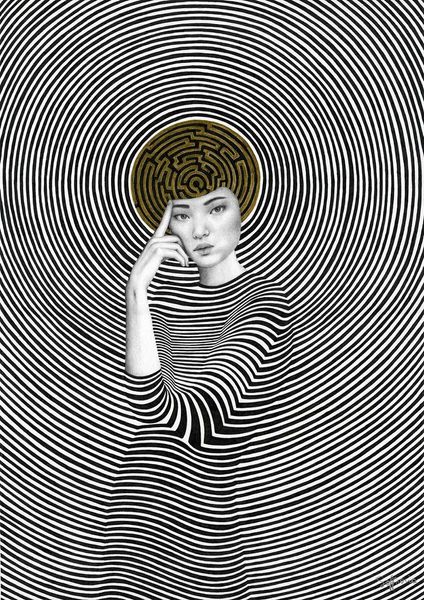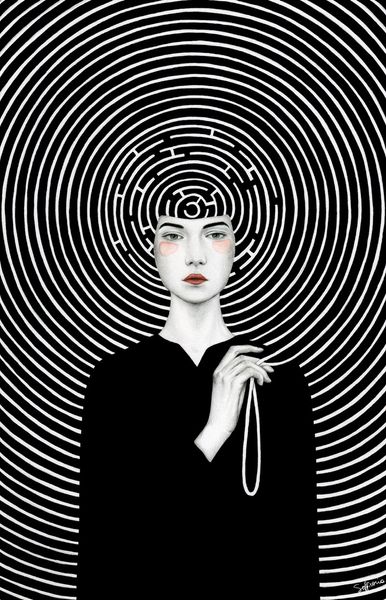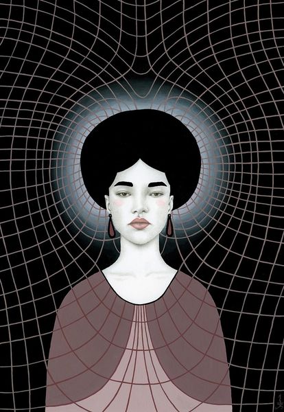 Editor: Here we have "Ariane" by Sofia Bonati. The piece captivates with its stark contrast and hypnotic lines, giving off an almost dizzying effect. The woman knitting within the vortex is particularly striking. What visual elements do you find most compelling? Curator: The success of the composition rests upon its masterful manipulation of line and figure-ground relationship. The monochrome palette facilitates the reading of the spirals as both enclosing and emanating from the figure. Observe how Bonati has constructed the image plane, contrasting the almost photorealistic face with the stylized geometric pattern, a dynamic tension between representation and abstraction. Editor: It's like she's trapped or creating this world simultaneously. Is there something specific about the spiraling lines? Curator: The spiral itself is an important motif in art history. Consider its symbolic charge as emblematic of cyclical time, transformation, or even a descent into the subconscious. Ask yourself, how does the application of these spirals impact your understanding? What new formal relationships does the artist expose? Editor: I see, so it's not just about the symbolism but how the artist is arranging those lines and the subject, within that constructed reality. This definitely gives me a fresh appreciation of its artistic structure. Curator: Precisely. By considering the formal qualities of "Ariane," we are better equipped to understand how the image functions and affects the viewer on a purely visual level, apart from iconographic interpretations. Editor: That makes a lot of sense. I never thought about vector art having this kind of impact. I am keen to discover more art by applying this approach. Thank you for expanding my horizon!