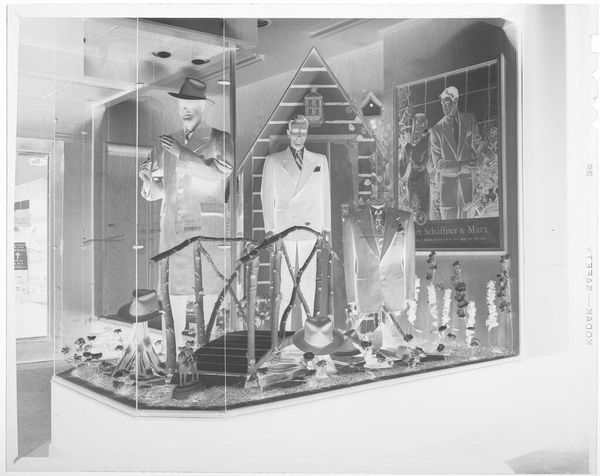 Curator: This striking image is an untitled work by Harris & Ewing, described as a store display featuring a flower shop, mannequins, and flowers. It is a gelatin silver print. Editor: What a peculiar mood! The mannequins and inverted tones give it a ghostly feeling, like a memory fading in a dream. Curator: It does seem dreamlike. The flowers themselves are powerful symbols of life, beauty, and transience, heightened here. Do you feel there is commentary on class? Editor: Perhaps. The materials of the mannequins themselves, the fabric of their clothes, and the labor involved in crafting this scene all speak to the economies of display. Curator: I see an exploration of beauty ideals as well. The staged presentation and the artificiality inherent in the mannequins invite us to question societal constructs of beauty. Editor: An interesting point. It underscores how much meaning we project onto materials, transforming the mundane into objects of desire and commerce. Curator: It leaves me contemplating how we imbue objects with symbolic power, especially in the context of consumer culture. Editor: And for me, it highlights the fascinating intersection of art, commerce, and the silent language of materials in shaping our desires.