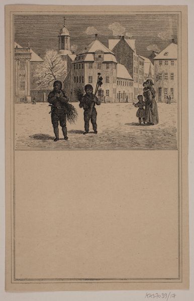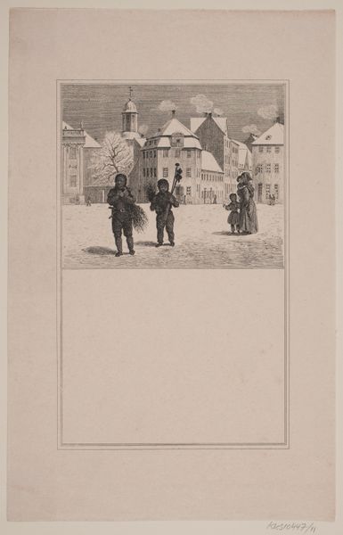 Jan Mesker created this print titled, 'Militairen bij een herberg' using etching. The composition is dominated by various shades of gray, skillfully capturing a winter scene. Notice how the texture created by the etching technique gives the image a grainy, almost tactile quality, enhancing the stark and cold atmosphere. The placement of figures and buildings divides the scene into distinct planes, creating depth and guiding our eyes through the village. The inn and church function as visual anchors, their architectural lines contrasting with the softer, organic shapes of the natural landscape. Mesker uses line to delineate form, but also to suggest movement, especially in the flock of birds overhead. These elements function semantically: the scene evokes a sense of a moment in time, the viewer is invited to decode the relationship between man, nature, and society. This interplay encourages reflection on the transient nature of human activity against the backdrop of the enduring natural world.