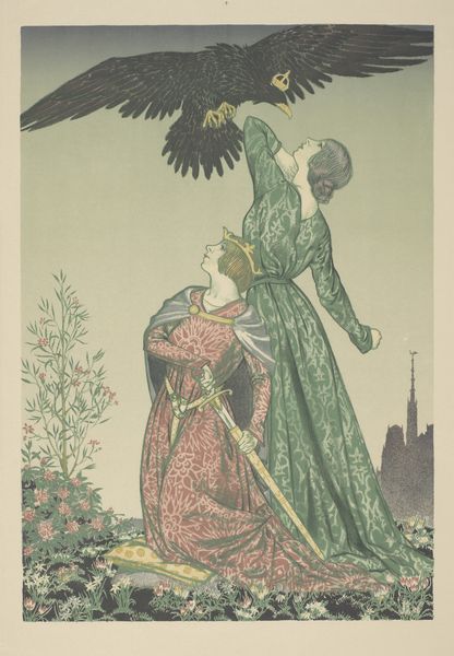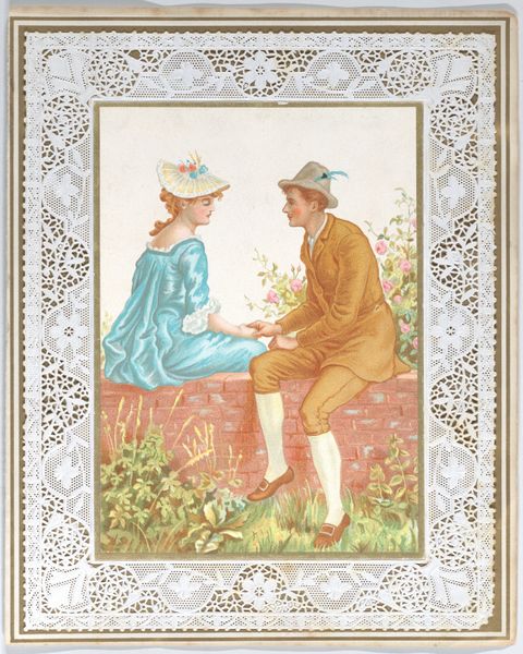 Editor: Here we have Kate Greenaway’s "Valentine," created in 1876. It looks like a watercolor illustration framed with lace. It evokes such a sweet, almost fairytale-like mood. What do you see in this piece? Curator: The symbols in this image speak volumes. Notice the blindfolded figure – she represents the blissful ignorance, or perhaps innocent expectation, associated with love. The lace trim itself signifies delicacy, fragility. It frames and protects this vision of romance, a memory of cultural traditions. Editor: The figure being blindfolded also feels very performative, like a playful game between the two lovers. Curator: Exactly! And consider the setting. The garden, with its cultivated roses and roaming peacocks, is a symbol of earthly paradise, a contained space for courtship and dalliance. Even the little details like the birds and the falling rose carry weight. Each element reinforces a carefully constructed idea of ideal love. Do you think that interpretation of 'ideal' still rings true today? Editor: I'm not sure, it's all a little too precious and innocent perhaps? Still, the image's composition and symbolism, the soft pastel hues, and the very tactile nature of watercolor—it's all quite effective. I suppose it points to lasting ideals. Curator: Indeed. Even if our expression of love has changed, the desire for that ideal remains, doesn't it? It's a visual echo that continues to resonate, prompting us to reflect on how love is symbolized and what values we continue to associate with it. Editor: I never would have thought of all those hidden meanings; now I can really appreciate what the artwork offers beyond the immediately obvious!