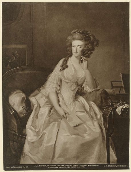 Editor: So, this albumen print from the 19th century is titled "Portret van Wilhelmina van Pruisen." There’s a serene quality to it, almost as if the subject is lost in thought. What strikes you most about this work? Curator: I’m immediately drawn to the complex social dynamics at play. Wilhelmina, as a Prussian princess and later Princess consort of the Netherlands, navigated a world defined by rigid gender roles and political power. How does this portrait, in its apparent simplicity, either uphold or challenge those expectations? Editor: That's a great question! I hadn’t thought about it like that. Perhaps her posture—slightly reclined, with her hand to her face—suggests a thoughtfulness, or even a weariness, that counters the expected image of a regal figure? Curator: Exactly. And consider the medium itself. The albumen print, relatively new at the time, allowed for wider distribution of images. Was this portrait intended as a straightforward representation of royalty, or did it subtly participate in constructing Wilhelmina’s public persona? What stories does it subtly tell about the concept of nationhood and belonging in the face of emerging ideas? Editor: That’s fascinating! It makes me reconsider how carefully curated these images were. So, it wasn’t just about capturing her likeness but crafting a specific narrative. Curator: Precisely. What implications do you think this has for interpreting portraits of powerful women throughout history? Editor: This conversation reframes the way I approach art. I'm thinking about the intersection of identity, power, and representation in a completely different light now. Thanks. Curator: Likewise, this highlights the continuing power of visual media to reinforce or question established hierarchies, encouraging all of us to think critically about the images we encounter.