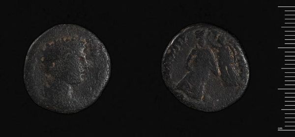 Curator: Here we have a coin of Antiochos VIII Grypos of Syria, currently held at the Harvard Art Museums. Editor: Its patinated surface and the shallow relief give it a solemn, weathered feel. I immediately think of the weight of history it carries. Curator: Coins, of course, weren’t just currency. They served as propaganda, disseminating the ruler's image and legitimacy throughout the kingdom. The portrait on one side and the symbolic figure on the other communicated power dynamics. Editor: The figure, possibly Zeus, is rigidly symmetrical, almost hieratic. Its placement within the circular frame creates a powerful focal point. Curator: That symbolism would have been deeply understood within the culture. It was a language of power and identity available to everyone. Editor: It's amazing how such a small object can hold so much cultural and political meaning. Curator: Exactly. These coins acted as crucial communicators in their time, and they continue to speak to us across the centuries.