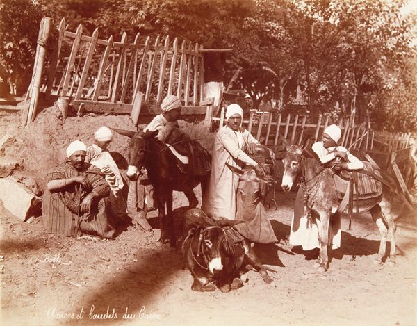 Curator: Félix Bonfils created this albumen print, titled "Donkey-drivers and Donkeys of Cairo," sometime during his career. It projects such a quiet stillness. Editor: It does, doesn't it? But look closer. The photograph provides a potent snapshot into power dynamics and labor practices in Cairo at the time. Curator: Precisely. Bonfils, as a Western photographer, was participating in and reinforcing Orientalist tropes, framing Cairo through a colonial gaze. Editor: The image itself, with its staged arrangement of people and animals, echoes that agenda. We can see how the donkey drivers are positioned in relation to their means of livelihood. Curator: The lack of agency afforded to those being depicted is palpable; their identities flattened into types for Western consumption. Editor: Yet it's still a beautiful piece, forcing us to consider how aesthetic appeal can be intertwined with complex socio-political realities. Curator: And how art can be both a reflection of and a contributor to societal power structures. Editor: A reminder of the critical lens we need to employ.