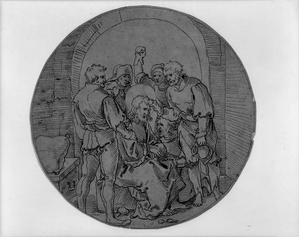 Curator: This roundel, "Christ Delivered to the People," presents a scene heavy with symbolic weight. The artist is, as yet, unknown. Editor: It strikes me as claustrophobic. The composition, confined within this small circular space, seems to intensify the drama. Curator: The engraver masterfully captured a pivotal moment. Look at the central placement of Christ, presented almost as a spectacle, embodying both power and vulnerability. Editor: The power dynamic is definitely interesting here; consider how the crowd's reactions could be interpreted differently, depending on your social position or religious belief. There is a strong patriarchal presence as well. Curator: Indeed. The cross in the background also resonates as a clear symbol of sacrifice and redemption. Editor: Such enduring symbols invite us to continuously reconsider their place within historical narratives. Curator: This small artwork provides a rich glimpse into enduring historical themes. Editor: It reminds us how art can both reflect and shape our understanding of societal power.