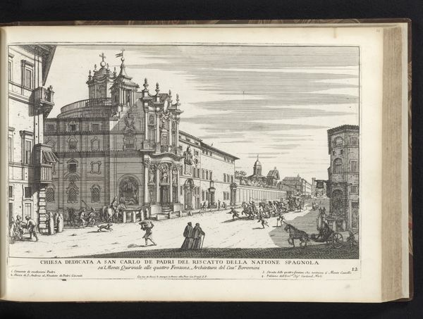 Editor: Here we have Giovanni Battista Falda’s “Fontana nella Piazza della Trinita de Monti,” an etching and engraving from 1691. It depicts a fountain in a bustling Roman piazza. It’s the crispness of the line work that really grabs me, especially in defining the fountain’s elaborate sculptural elements. What jumps out to you as you examine its formal properties? Curator: Indeed, the graphic precision is compelling. Note the sharp contrast Falda establishes through the confident hatching and cross-hatching. Consider how this technique defines not only the forms of the fountain, but also the architectural masses and the atmospheric recession into the distance. Does the linear precision create a sense of objectivity, perhaps even detachment, in the representation? Editor: Yes, definitely. There is a very geometrical feeling, especially how all elements are connected, almost architectural. Do you think that Falda focused less on portraying what he felt, and more on the spatial logic of the piece? Curator: Precisely. It eschews emotional subjectivity. Instead, attention is directed towards the interplay of lines and shapes to construct a visually coherent space. What is the effect of the low horizon line on the overall composition, and how does that affect the viewer's experience of space within the print? Editor: Because it's lower, it seems to make the architectural elements bigger. The structures really come forward and almost seem to surround the viewer. Curator: Notice how that reinforces the sense of designed space, organized by principles of perspective, where architectural elements articulate and measure the extension. This ordered configuration encourages observation of relationships, more than it stimulates participation, wouldn't you say? Editor: I agree. Focusing on that structured space really makes the composition legible and helps to clarify my experience of the work. Thank you! Curator: My pleasure. That focused observation is, after all, central to its aesthetic experience.