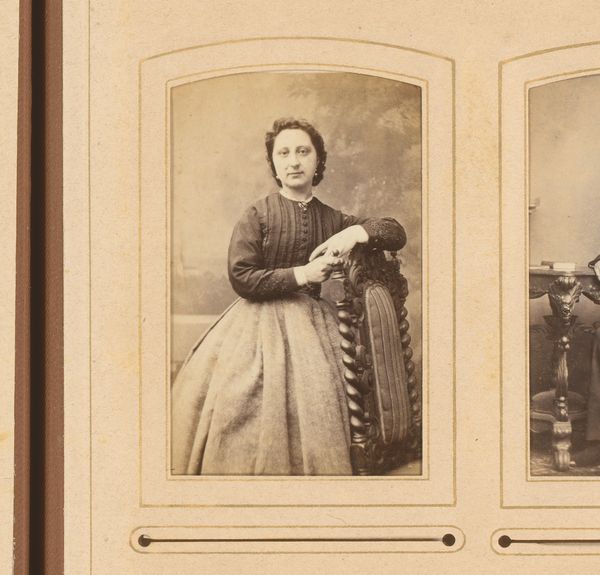 Editor: This is "Portret van een staande vrouw bij een stoel," or "Portrait of a standing woman by a chair," a gelatin-silver print made sometime between 1851 and 1884 by Herman Bückmann. I find it fascinating how posed it is, the way she rigidly leans against that elaborate chair. What can you tell me about this portrait? Curator: This portrait provides a powerful window into the socio-political constraints placed on women during the 19th century. Consider her posture, her dress, even the setting. The ornate chair acts as a prop, reinforcing notions of domesticity and prescribed roles. How does her gaze strike you? Editor: It feels a little sad, maybe resigned? Like she's performing a role rather than expressing herself freely. Curator: Precisely. This photograph operates on multiple levels. While seemingly a straightforward portrait, it subtly reveals the limitations imposed on women's self-expression. Photography during this period was often used to reinforce social norms, creating a visual archive of expected behaviors. It also makes you wonder about the artist’s intentions. What message was Bückmann trying to convey through her image? Editor: That’s true; it's difficult to see the photographer's intention! I hadn't considered the performative aspect so deeply. Thanks for making me think about gender and its intersection with social norms in historical portraits. Curator: My pleasure. Reflecting on these early photographic portraits, considering the restrictions and expectations, allows us a clearer view of women's agency, resistance, and resilience within limited spaces.